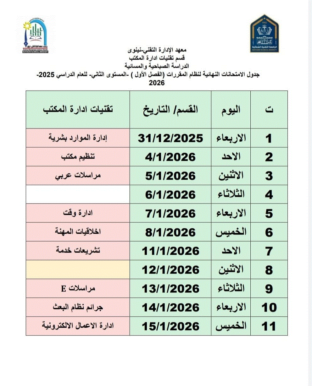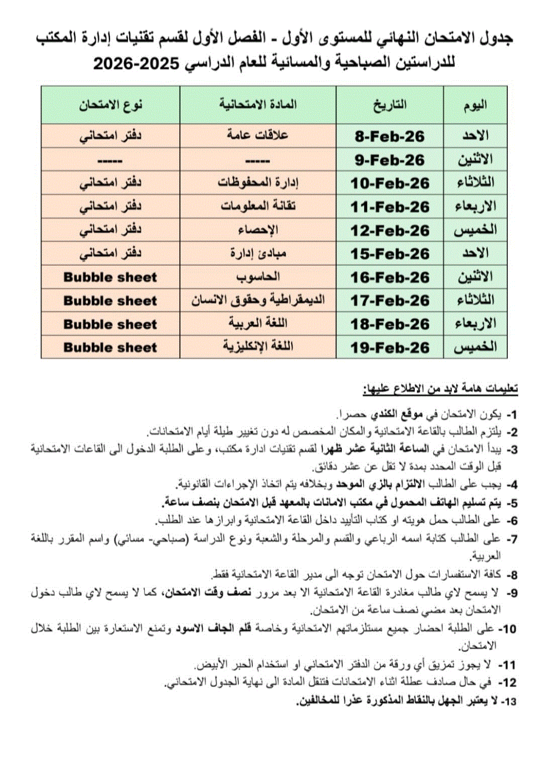 • جداول الامتحانات قسم تقنيات ادارة المكتب